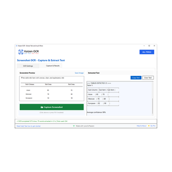 Kaizen OCR includes a built-in snipping tool and an optional F6 shortcut to capture any part of the screen and extract text instantly. OCR engine and language can be configured as needed.
