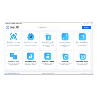 Kaizen OCR & PDF is a Windows desktop application designed to help users extract text, manage documents, and work efficiently with images and PDF files—all completely offline. Built using C# WinForms, the software focuses on speed, privacy, and simplicity while offering a wide range of PDF and OCR tools in a single interface.