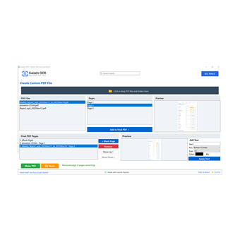Users can combine pages from multiple PDFs, reorder them, insert blank pages, and add custom text annotations before generating a final PDF.